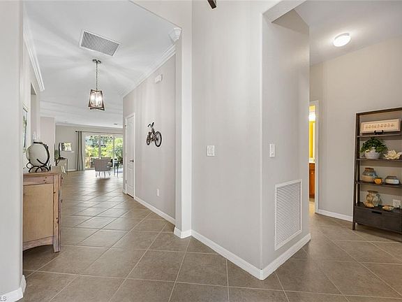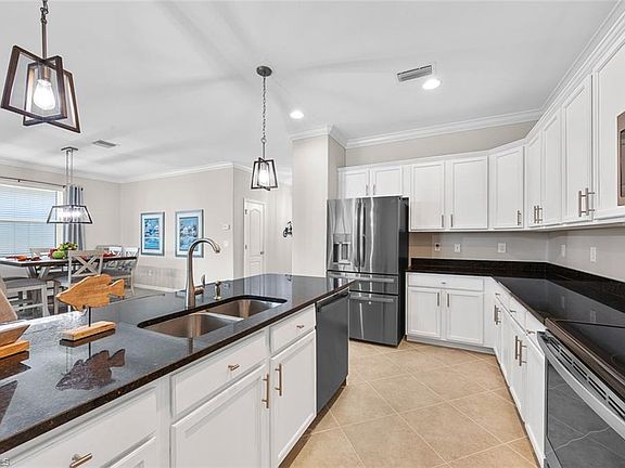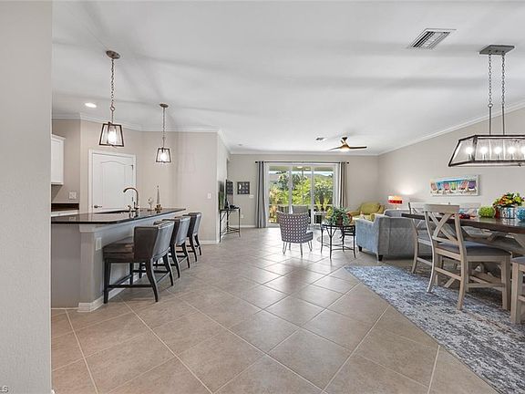 Beautiful Trevi floor plan offering over 2,000sf of living space. Featuring elegant front entry, open concept kitchen with granite counter tops, walk-in pantry, designer wood cabinets, stainless appliances, large island/breakfast bar overlooking great room. Also features full guest suite, split floor plan large tile flooring, crown molding, large panel sliders to screen lanai. Olympia Pointe is a desirable gated community with amenities galore including clubhouse and pool/spa. Conveniently located with easy access to I-75, the SWFL INT airport also dining and shopping. Low HOA fees and so much more.