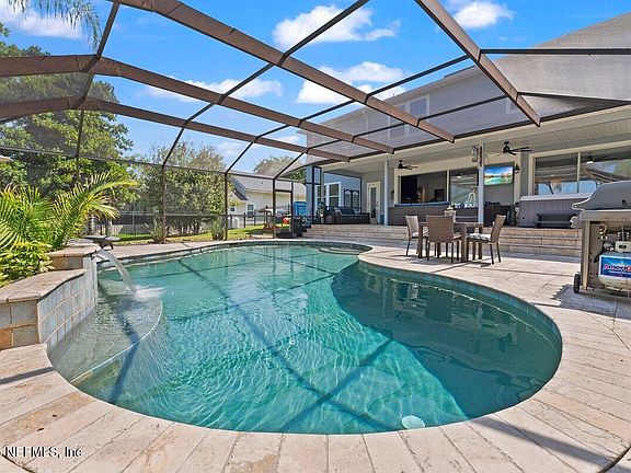 Stunning colonial-style POOL home on navigable water with private dock, additional floating docks, and new pylons—perfect for boaters and waterfront lovers alike. Enjoy a backyard oasis with a pebble quartz finish pool, hot tub, travertine lanai, new screened enclosure with custom lighting, and serene, unobstructed water views.
