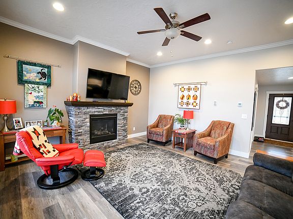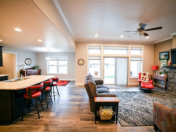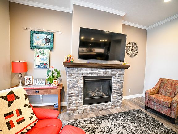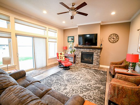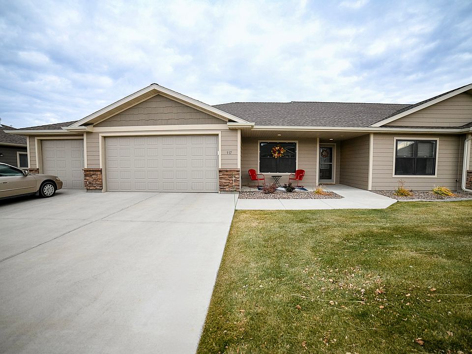 Highly sought-after one-level West Ridge Townhome! This beautiful 3-bedroom, 2-bath home offers an open floor plan with a spacious kitchen featuring an island and stainless-steel appliances. The inviting family room boasts 10-foot raised ceilings with crown molding, a cozy gas fireplace, and a sliding door that opens to a private covered patio overlooking the fully enclosed yard with vinyl fencing. The primary suite includes a large walk-in closet and a bathroom with a walk-in shower and double vanity sinks. Enjoy the convenience of a main-floor laundry room complete with a sink and extra storage. A three-car garage provides plenty of space, with the third stall partitioned off and featuring radiant floor heat —perfect for a craft room, workshop, fitness space, or man cave. Additional features include central air, underground sprinklers, and HOA-covered lawn care and snow removal for easy living.