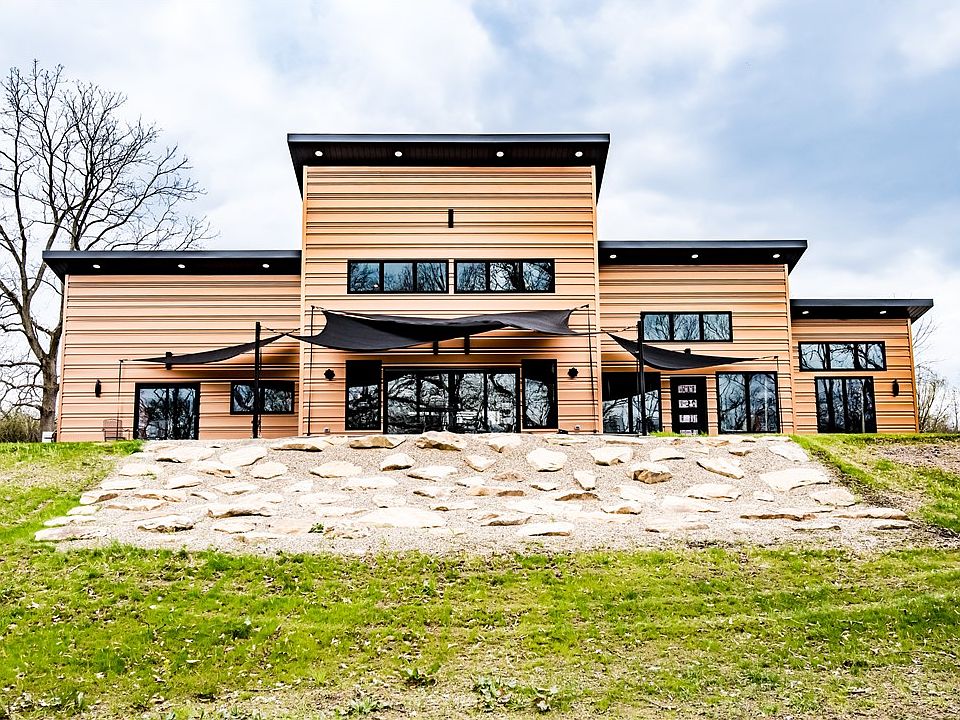 Architectural linesCustom epoxy flooringArtful touchesWalnut groveNatural lightSoaring ceilingsOpen-concept layout