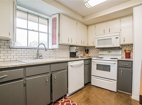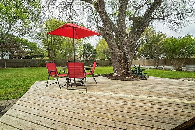 No HOA! Super cute single story home in Oakcrest Estates w updated kitchen (butcher block/granite counter tops, & subway tile back splash.) Open floor plan enjoys view of your your gorgeous backyard. The inside and outside are perfect for relaxing day to day living or good times entertaining! With back deck, water feature & separate laundry room (that is big enough for an outside workspace or office.) Great walk in closets in each room. Close to I35 & the Rivery shopping center.