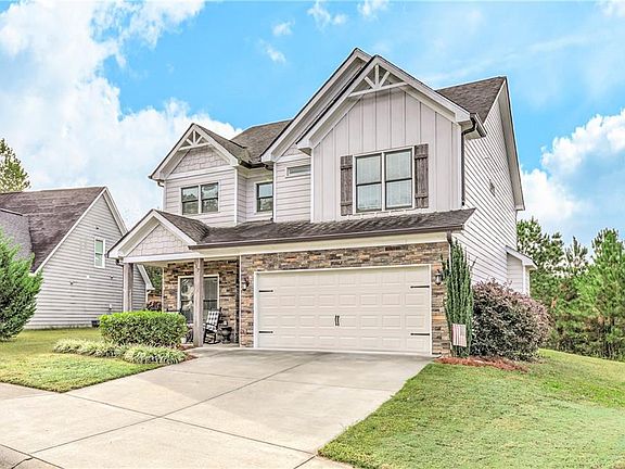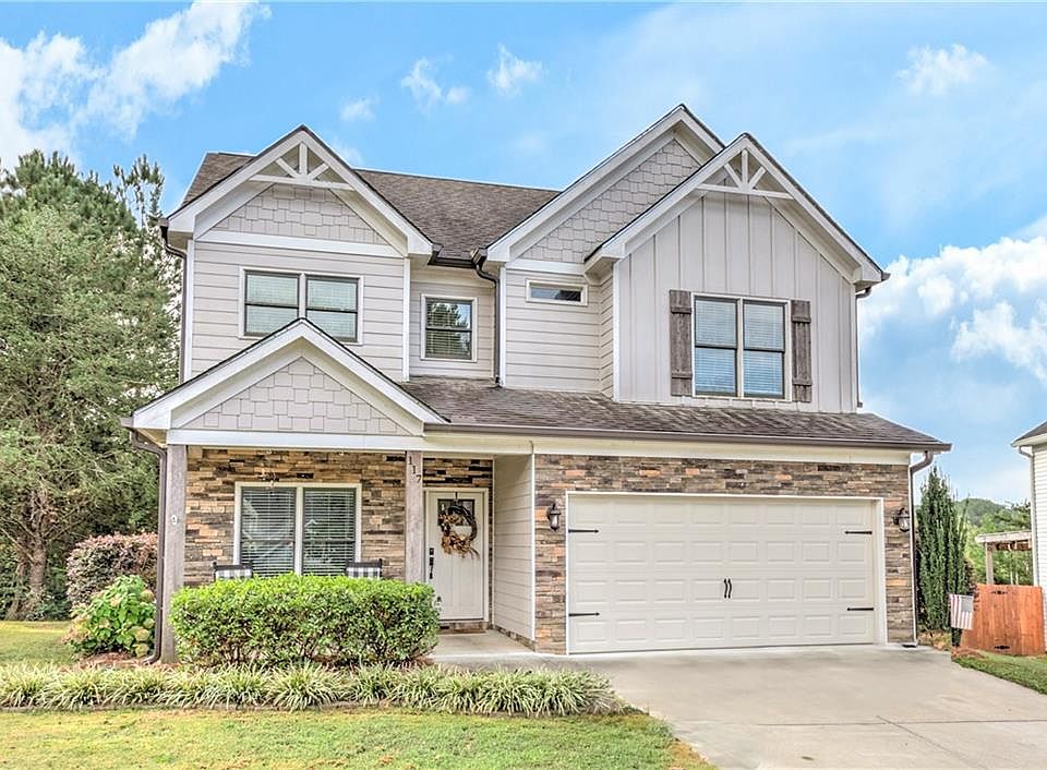 Nestled on a quiet cul-de-sac in the private community of Olde Mill, this gorgeous craftsman style home showcases Amaretto Birch hardwood floors throughout and an inviting open floor plan perfect for everyday living or entertaining. The spacious kitchen features stainless steel appliances, crisp white cabinetry, a tile backsplash, and a custom island with seating, all with views of the fireside family room and breakfast area. The formal dining room offers the perfect setting for hosting family and friends. The oversized owner’s suite impresses with vaulted ceilings, sliding barn door, dual vanities, a standing shower, a large soaking tub, and a huge walk-in closet—all enhanced by a serene mountain view. Step outside to enjoy the private backyard from the expansive deck, ideal for relaxing or entertaining. Conveniently located just minutes from Historic Downtown Ball Ground, Canton Marketplace, and Cherokee Hospital, this home combines privacy, comfort, and convenience in one exceptional setting.