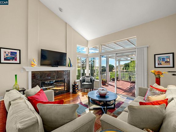 Pristine and impeccably maintained single story on a premium golf course lot backing to 5th fairway at Oakhurst Country Club tucked away at the end of the court! Step into the warm, light-filled entry with soaring ceiling, gorgeous wide plank hardwood floors that extend into the combined living and dining room featuring a cozy fireplace and sliding glass door leading to the rear deck. The gourmet kitchen boasts slab granite counters featuring a full backsplash, breakfast bar, an abundance of elegant white cabinets, sunny garden window and a casual dining area with bay windows. Spacious primary suite boasts high ceilings & two mirrored closets with sitting area looking out to sweeping golf course and hill views. The adjoining updated primary bath offers slab counters with dual sinks, tile flooring, contemporary lighting and large walk-in shower with decorative tile accents. Step outside onto the expansive pergola covered deck and enjoy the magnificent views, beautiful sunsets and watch the golfers go by. Beautifully landscaped with low maintenance and drought tolerant flowers, shrubs and ornamentals, extensive hardscape, & coved deck. Must see!