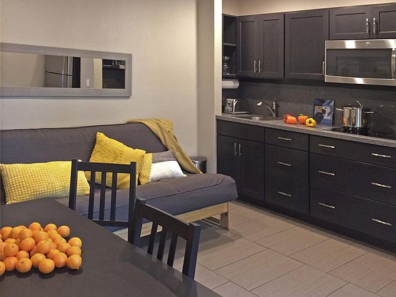 You'll find a designer-styled, bright, and open kitchen area featuring radiant-heated porcelain tiled floor, stainless steel appliances, induction stove, recessed lighting, and eating and sitting areas with free HD cable TV. A futon couch can accommodate overnight guests.