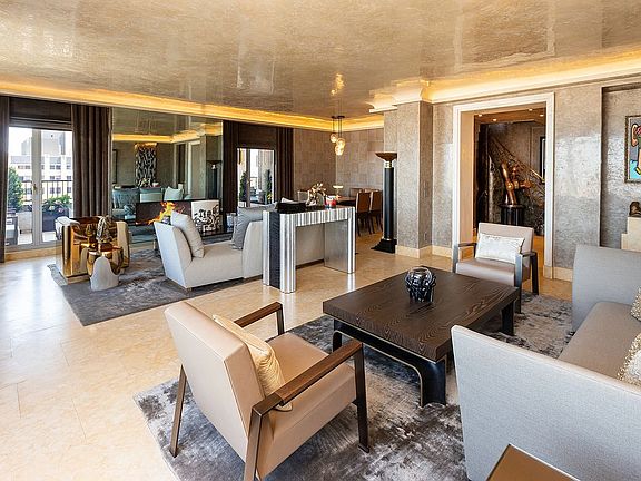 The chef’s kitchen, crowned with a hand-painted ceiling of drifting clouds, combines modern functionality with timeless elegance. A sweeping wrought-iron staircase rises through the residence like a sculpture, leading to the upper levels and the private bedroom suites above. The primary suite offers unmatched serenity and scale, while the bathrooms — clad in Calacatta Oro and black Portoro marble — are sanctuaries of pure elegance.