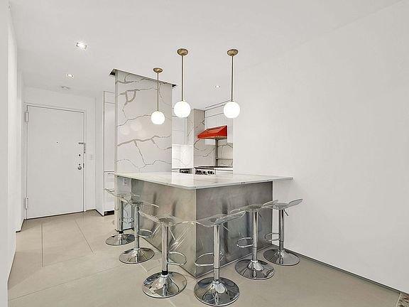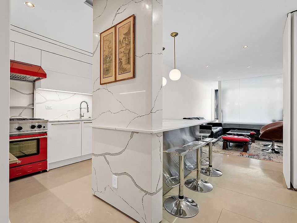 Completely re-imagined down to the beams, this one-of-a-kind, turnkey, studio was designed to have a full sized chef’s kitchen, terrazzo floors, Lutron recessed lighting throughout, and a sleeping area that gives it a feel of a one bedroom apartment. The gorgeous open kitchen is wrapped in stunning Calacatta marble and accented by a dramatic stainless steel wall. Rare in studio living, this kitchen is fitted with bi-fold lift cabinetry, a wine fridge, refrigerator, dishwasher, BlueStar gas stove and a marble peninsula that seats Six.