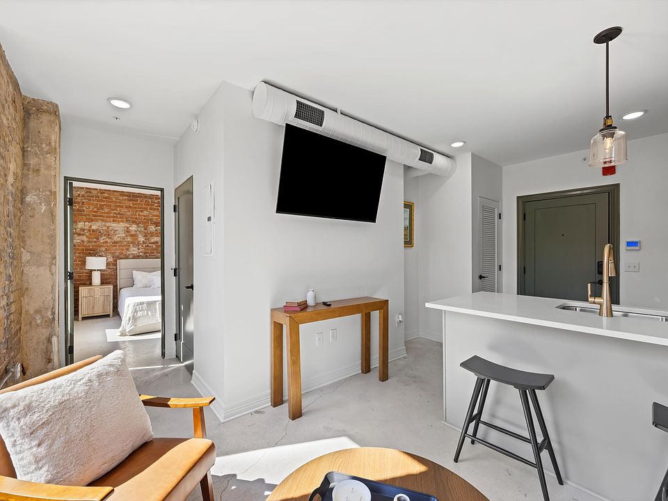 This south-facing unit features exposed original brick, oversized windows with abundant natural light, and stunning views of downtown extending toward Lookout Mountain. Washer/dryer hookups and space for custom closet systems offer functionality and flexibility.