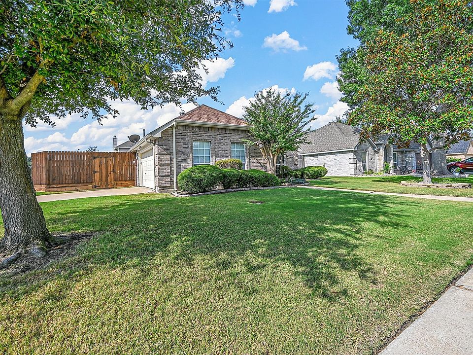 This charming home sits on a beautifully landscaped corner lot, & backyard with a stunning 8-ft wooden stained fence. Boasting 3 bedrooms, 2 baths, & a 2 car garage spanning 1545 SF, this home exudes warmth from the moment you step inside. The spacious family room seamlessly connects to the kitchen, featuring a wood-burning fireplace with a gas starter, & a beautiful plant ledge. The kitchen comes with new appliances and a conveying refrigerator. Each bedroom is adorned with new carpeting, with the primary bedroom offering ample natural light through large windows, an ensuite bath with double vanity, jetted tub, and a walk-in shower. Split bedroom plan places the other 2 bedrooms on the opposite side of the house, with a guest bath nestled between them. The home includes a washer & dryer, surround sound in garage & backyard, & a tiled sunroom with AC. Outside, the meticulously maintained backyard showcases exquisite landscaping, a storage shed, & even doggy windows on the fence.