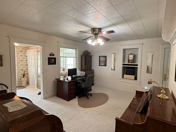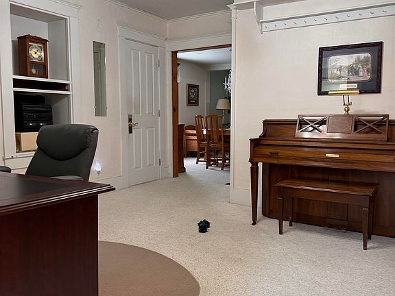 Updated and ready for new owners. This home has been loved and cared for by all of the owners over the past 100 years. There are two bedrooms and 1 1/2 half baths on the main level and possibly two more just waiting for a decorator's touch upstairs. Enjoy the open floor plan featuring a gas log fireplace and dining area. Spacious eat-in kitchen with range, refrigerator, dishwasher, and an original wood built-in pantry. Charming enclosed front porch and a pantry/storage area that accesses the back deck. BONUS FEATURE, an oversized garage, and a workshop that would make any handy person the best workspace ever. Roof new December 2022, New gutters and gutter guard Jan 2023, New Landscaping 2024, Updated half bath 2024.