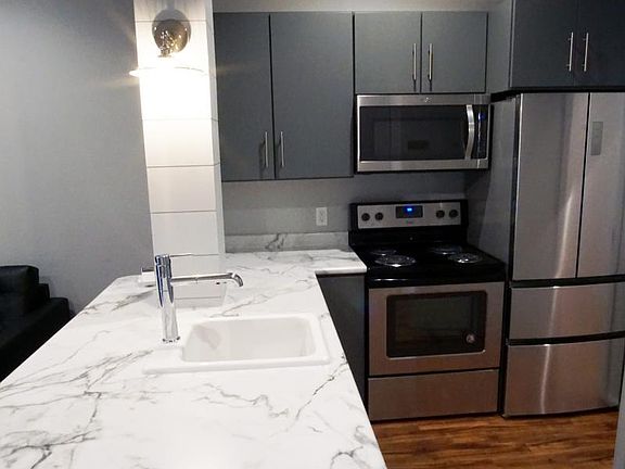 Street light island, L-shaped kitchen with eating area, Downtown views, ?2 TVs, Full Size Bed, Sofa, Coffee Table Owner responsible for utilities, internet, cable, trash, and security.