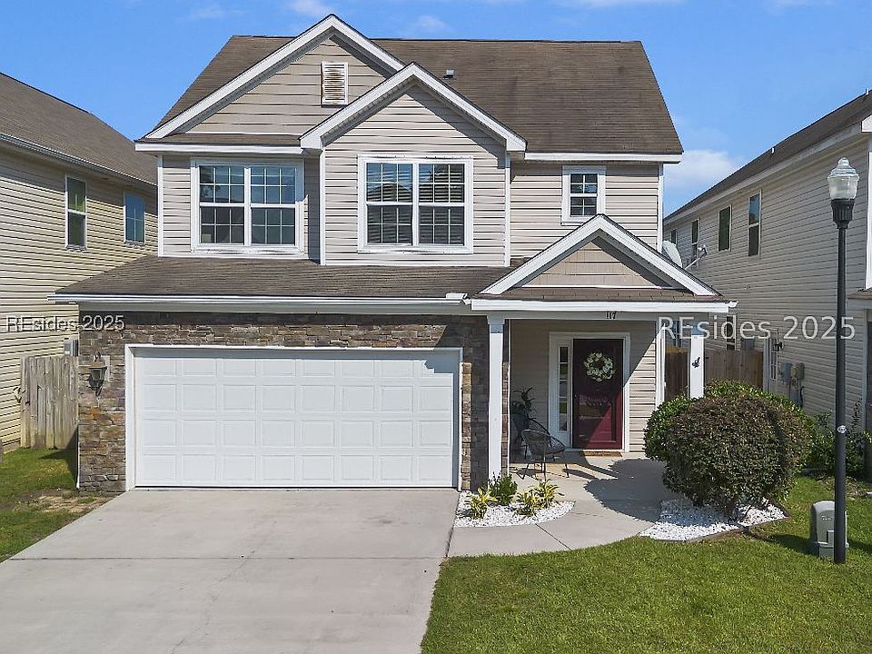 Welcome to 117 Glory Road, a spacious home in the desirable Liberty Point community. This Belfair model boasts an open floor plan with a spacious living room, kitchen combo, and a Sunroom/Carolina Room. The kitchen shines with granite countertops, custom backsplash, double ovens, a built-in desk, coffee bar, along with a newer dishwasher and disposal. Enjoy brand new carpet upstairs, where there are three bedrooms, two full baths, and the laundry room. The primary suite features separate vanities, walk-in shower, and walk-in closet. Additional perks include a tankless water heater, a fully fenced backyard with a large patio, and a prime location just 15 minutes from Parris Island and MCAS Beaufort. Convenient to schools and shopping.