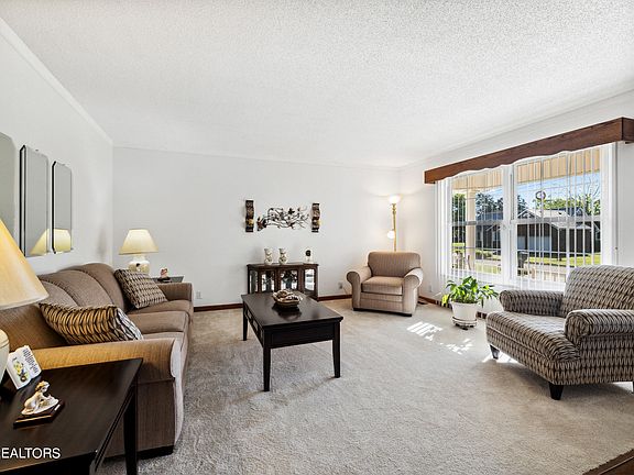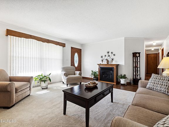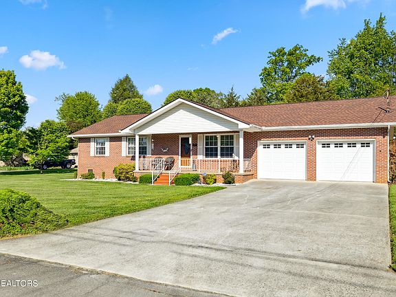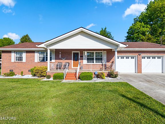 Absolutely immaculate brick rancher on nice level lot with OVERSIZED GARAGE!! Kitchen with abundance of oak cabinetry & breakfast bar, frig, gas range, DW, & MW. Great room with fireplace, family room with fireplace, dining room open to kitchen and family room for easy entertaining. Primary bedroom with adjoining bath with double vanity & shower, 2 additional bedrooms plus full hall bath. LARGE utility room with lots of storage space. Covered front porch and side porch with composite decking. TONS of Updates including newer roof and vinyl windows. Great location!! Just minutes to I-75, schools, shopping & dining, parks and Norris Lake, & hospitals.