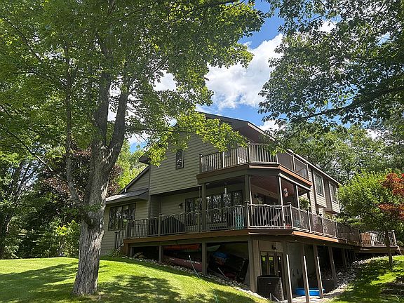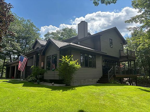 Attractive curb appeal home on high wooded lot with an overlooking view of Sunset Lake from the multi-level deck complete with hot tub. Nicely tiered landscaping and paved circular drive entrance. This home features 4-5 bedrooms, 4 baths, Master Suite with walk out to balcony deck and scenic view! Eat in kitchen, formal dining with 16 feet ceiling. The double sided fireplace is shared between family room and living room. First floor laundry. Lower level includes office, fifth bedroom, work/hobby area and third family room with walk out! The 3 car garage and storage shed provide room for all your toys and needs.
