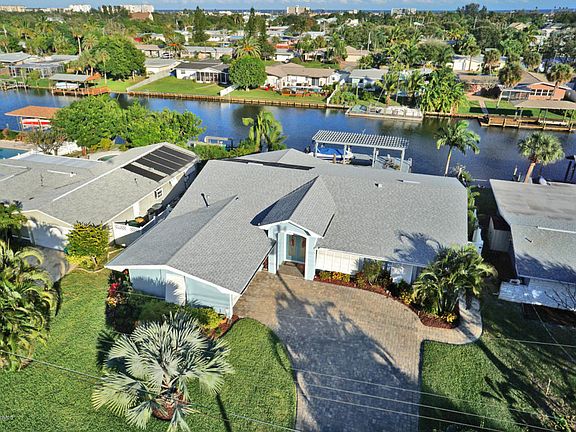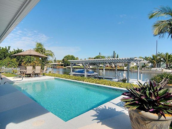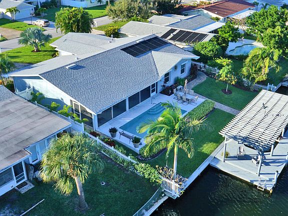 True Floridian Lifestyle! Completely rebuilt in 2011 this energy efficient waterfront pool home has it all: 4 Bedrooms, 3 Baths, Solar Heated Pool, Lanai, Dock, & Pergola Boat House w/ Lift. Beautiful glass double door entry. Open floor plan w/ great room overlooking pool & water. Chefs kitchen complete w/ huge island, high-end stainless GE appliances & gas cook top, double ovens, & granite counter tops. Waterfront master suite w/ sitting area, en-suite bath & his/her closets. Beautiful hickory hardwood flooring. Guest room w/ en-suite bath overlooking the water. Formal dining room. Hunter-Douglas shades. Surround sound. NEW: roof, electrical, plumbing, A/C, tankless water heater, impact windows & plantation shutters. Great room opens onto Lanai, Pool, Beautiful Yard, Boat House, & Dock.