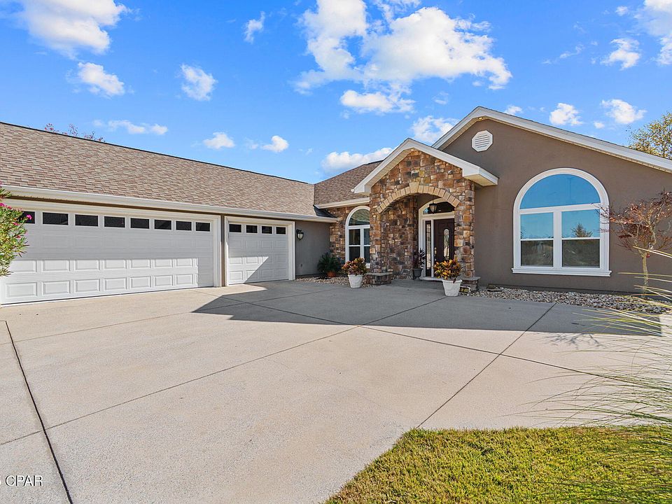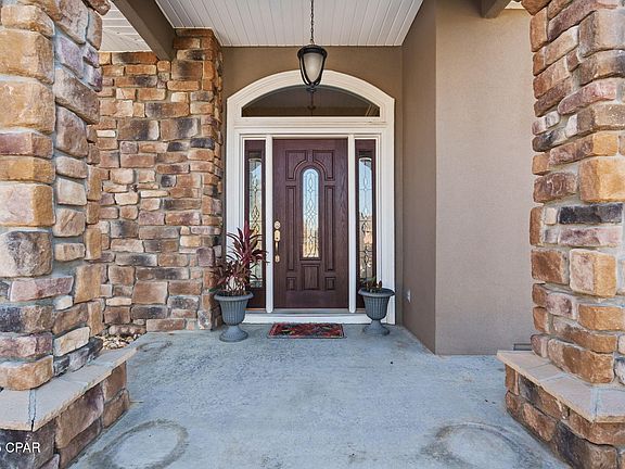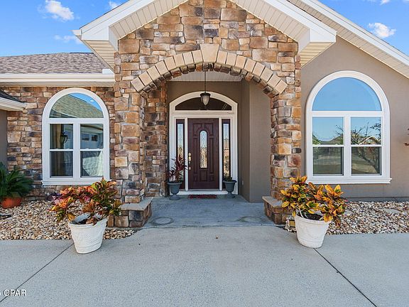 Welcome to The Meadows, one of Lynn Haven's most sought-after golf course communities. This stunning 3 bed, 2 bath, 2,130 sq ft home blends traditional charm with comfortable living. From the moment you arrive, the inviting arched entryway and front porch set the tone for the warm, welcoming feel throughout. Step inside to soaring tall ceilings, a spacious great room, and elegant French doors lining the back wall, filling the home with natural light and offering a beautiful view of your private screened-in pool. The kitchen is a dream for anyone who loves to cook or entertain, featuring granite countertops, abundant cabinet storage, a built-in desk area, stainless steel appliances, a breakfast bar, cozy breakfast nook, and a separate formal dining room perfect for gatherings. The thoughtful layout continues with a well-appointed laundry room complete with cabinetry, a sink, and a fold-out ironing board. Storage is plentiful with a coat closet by the front door, linen closets for each bathroom, and a spacious three-car garage. Both bathrooms offer cultured marble countertops, with the guest bath showcasing an oversized vanity and a tub/shower combo. The master bedroom has plenty of space, paired with a beautiful master bathroom. Double vanity with cultured marble countertops, matching with the standing shower, and jetted tub. The walk-in closet is built out with a linen closet and separate toilet room. Outside, enjoy your own personal oasis, a privacy-fenced backyard and a screen-enclosed pool, and back patio ideal for relaxing afternoons or hosting friends and family. If important, buyer to verify all information and measurements.