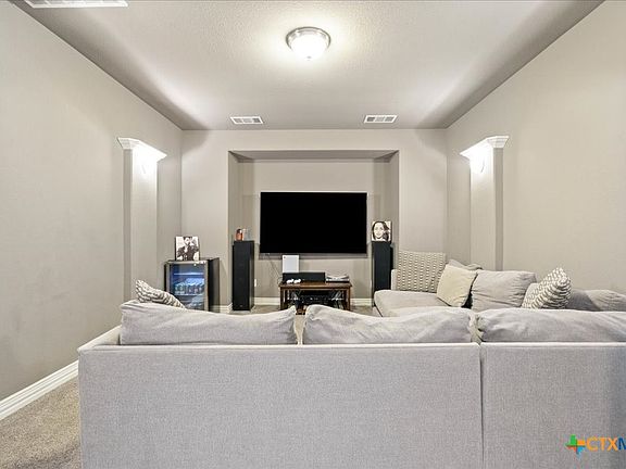 MOTIVATED SELLER! Explore this luxurious former model home located in the vibrant Santa Rita Ranch community in Liberty Hill, TX. The property is the perfect blend of modern style and comfortable living. With an open-concept design, it's ideal for entertaining and family life. A media room, complete with surround sound and a wet bar, enhances the home’s entertainment potential. The kitchen is both stylish and functional, designed to meet your culinary needs. Additional highlights include two dining areas and a custom-built office with shelving for your workspace. The laundry room is equipped with a dog shower, easily convertible into a stand-alone shower, adding practicality to the space. The primary suite is a serene retreat, featuring tall windows that overlook the backyard, and an en-suite bathroom with a spacious tub and separate walk-in shower. A second en-suite bedroom also offers a full bathroom with a shower/tub combo. Two additional large bedrooms, located near the media room, share a full bathroom with a shower/tub combination. Step outside to a large backyard, where you'll find a covered patio and a fire pit surrounded by built-in seating—perfect for cozy family gatherings or entertaining friends. This beautifully designed home sits close to all the fantastic resort-style amenities of the Santa Rita Ranch community, making it a perfect sanctuary for modern living.