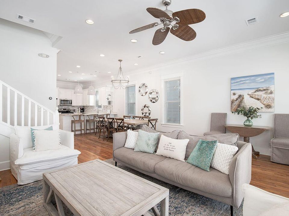 Freshly painted outside and tastefully updated within, this desirable beach home is well located between Alys and Rosemary Beach shops and eateries. Ideal as a primary or vacation property, this spacious coastal home is move in ready with four bedrooms plus bunks and three-and-a-half baths. Steps lead up to the traditional front porch, which provides a shady space for relaxation. Hardwood flooring greets you at the entrance. The sizeable living space is anchored by a feature fireplace, shiplap walls, soaring 10-ft. ceilings and elegant crown molding. There are windows on each side of the front door and a transom window above, casting ample natural daylight into this newly furnished space. Continue through the designated family dining area to the well-equipped chef's kitchen. Generously sized, it boasts wrap-around quartz countertops that create a handy bar for kitchen conversations. There's a guest bedroom on this level with direct access to a full bath and to the covered back porch. Wood stairs lead up to the second level which has 2 additional bedrooms, both with private balconies, and the bunk area. Double doors invite you into the large master suite boasting a King bed, a sitting area, desk, and walk in closet. The master bath has an oversized shower and jetted tub. Doors from the master open onto a private balcony with tree-top and views. The third floor offers a huge bonus space, currently furnished as a hangout with multiple beds, a card table, a wet bar with beverage cooler, and a half bath. The top floor balcony offers beautiful views over the Rosemary Beach rooftops. Located on the southeast corner of Seacrest Beach, once you park the car you can walk to everything from this lovely beach house. Peddler's Pavilion, just before Rosemary Beach, has its own shops, restaurants and a Starbucks making it easy to pick up your favorite iced coffee before heading to the white sandy beach. There's a walking trail right outside the door leading directly to 30A and the sparkling resort style community pool is a short stroll away.