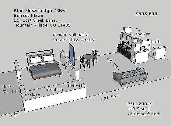 Enjoy a Telluride ski in/out studio in the MV town core. Blue Mesa Lodge 23B-r is on Sunset Plaza, with 441 sq ft., and a spacious 5' x 14' deck. Ski in ski out to lifts 1, 4, 10. A 2 minute walk to the gondola. With a full kitchen and a large bathroom with separate shower. A gas fireplace with built-in shelves. A partitioned sleeping area next to the deck. An elevator building and a free HOA laundry. The 23B ski locker and the ski changing room are feet from the slopes. HOA dues cover all utilities, except for a $80 mo. fast internet & small annual TMVOA dues. Excellent income from short or long term rentals, in addition to owner enjoyment. A premier location with ski and gondola access. Like no other place in the Heart of Mountain Village! 24 hours+ notice to show.