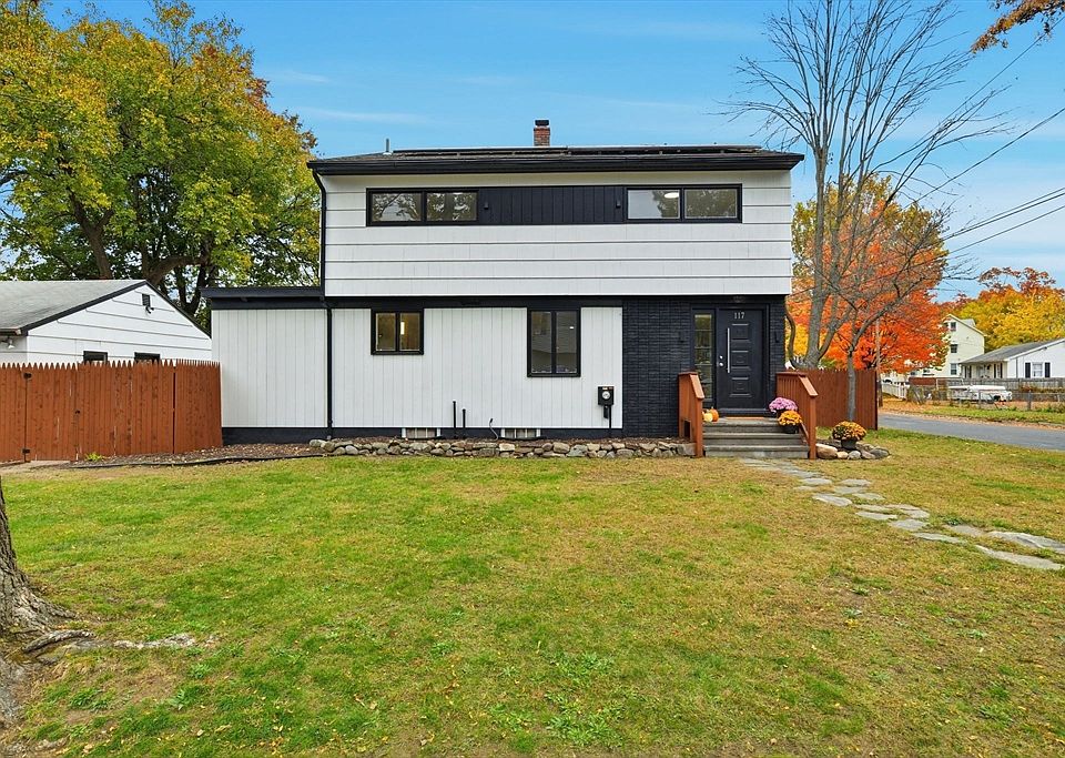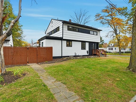 Walk into a refreshed contemporary design Colonial! Beautifully updated home showcasing bright interiors, quality finishes, & spacious rooms throughout.The first floor offers a bright living room w/ large windows & new flooring, a stylish full bath w/ a black accent wall, & a show stopping NEW kitchen w/ white cabinetry, SS appliances, marble-style tile floors, & custom wood panel trim detail. A first floor versatile room for a bedroom or office space completes the main level. The second floor includes four bedrooms w/ wall to wall carpet. A second full bathroom highlighting a tiled shower w/ stone countertops. A finished room in the lower level adds additional space for a workshop, a second office, or fitness room. Outside, enjoy a private fenced yard w/ plenty of space for outdoor activities & an oversized approx. 700 square foot garage w/ one side for parking & the other side for storage or additional use. Close to area amenities. Open House, Sunday, November 2nd, 12-1:30pm