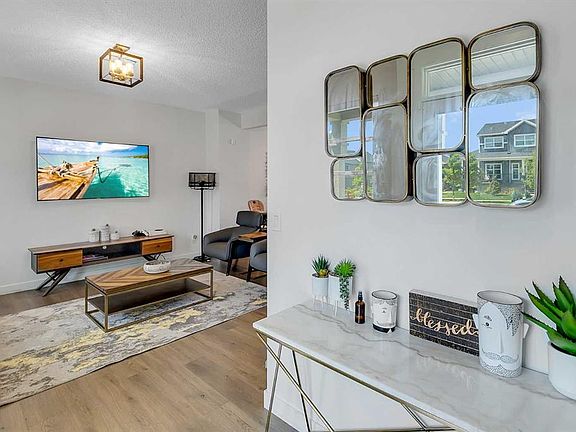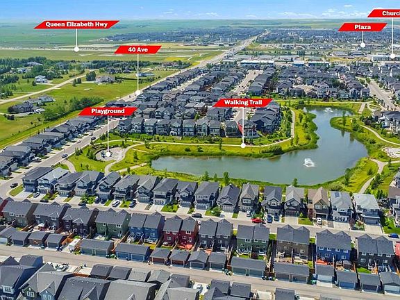 Welcome to this beauty in Lanark, SE Airdrie; over 2100 sq ft of developed living space with upgraded, Hardie-board exterior sidings. This centrally, air-conditioned 2021 built, semi-detached home is also situated about 5 minutes from Calgary. The main floor comprises of a bright, open floor plan with spacious living area, dining area, mud room and a half bath. The kitchen area features quartz countertop, water-fall island, smart/stainless-steel appliances as well as a touch-screen refrigerator and upgraded cabinetry for a seamless cooking and dining experience. The upper floor features 3 bedroom and 2 bathrooms. The primary bedroom includes a walk-in closet and an ensuite bathroom. Down below, the over 650 sq ft fully finished basement includes a living space, 4pc full bathroom, bedroom and a living/recreational area. Step outside into the fully landscaped and fenced backyard; you have the option of relaxing on the deck, making some BBQ with friends in the summer or just enjoying the sizable backyard with family. The two-car detached garage completes your back yard. You also have the option of enjoying the basketball court, skating rink or other amenities close in the community. This home is very accessible; few mins away from the QEII highway and near lots of amenities, mins walk/drive to green spaces, parks, bike paths, schools, medical offices, gyms, bus stops, public transportation and more. This home is for sale by the first and only owner; owner lived in the house throughout and the house is well taken care, just waiting for the next owner. Book your showing today.