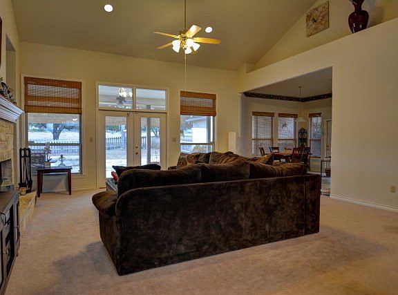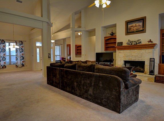 Hill Country classic in sought after community of Cypress Springs Estates. Level lot with views boasts nearly 3000 sf limestone home with over 1100 sf of covered exterior living space! Tons of windows allow tons of light, soaring ceilings & beautiful fireplace focal point in living room, kitchen open to eat in breakfast area, split bedroom floorplan and office has beautiful Oak built-ins. Formal