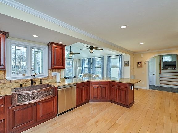 BACK ON THE MARKET DUE TO BUYER FINANCING This beautifully maintained expanded Cape has so much to offer, with its lovely Farmer's porch, updated kitchen which includes cherry cabinets, granite counters, copper sink, SS appliances, Viking stovetop and direct access to a two-car garage with lots of storage and workroom. The home also features a sunlit living room, dining room, a huge family room perfect for entertaining, 5 good size bedrooms and 2 full bathrooms all with central air. Enjoy the outdoors this summer grilling on the patio, relaxing by the pool or admiring the fenced in landscaped yard with irrigation system. Located near shopping and restaurants, schools, playground, major highways and the Rail Trail.