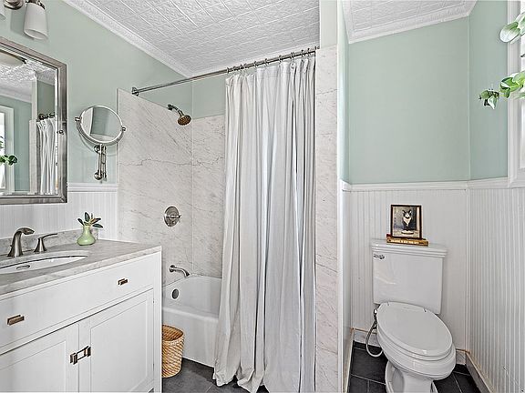 The large, windowed marble bathroom is sunny and elegant, with timeless finishes and excellent scale. A full laundry closet with a stackable washer and dryer and bonus storage adds ease to daily life.