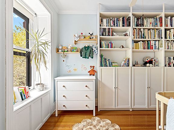 The south-facing primary bedroom offers a peaceful retreat with a decorative fireplace and an outfitted double closet. The second windowed room, used currently as a child's room, has built-in shelving and a deep closet, is perfectly scaled and could also function as a generous home office.