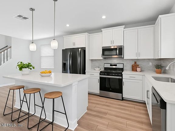 Lovely rear entry garage Cranston floor plan built by Mattamy Homes features a large living room and spacious dining room that looks out to an extended, covered lanai. Kitchen has premium quartz countertops, 42'' white cabinets, designer tile backsplash and natural gas stove and stainless steel appliances. Home comes with 5 1/4'' baseboards, 9' ceilings downstairs, under-stair storage, beautiful stair railing, a half bath, luxury vinyl plank flooring and LED lights. Upstairs has a generously sized laundry room, primary suite with tray/LED ceiling, two closets, private water closet, and a tiled 5' walk-in shower. Large front porch. Fully landscaped and irrigated yard within walking distance to school and amenities. Rear entry garage, fully fenced back yard.