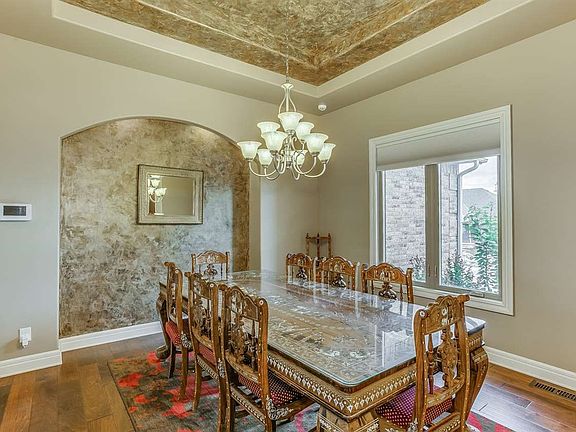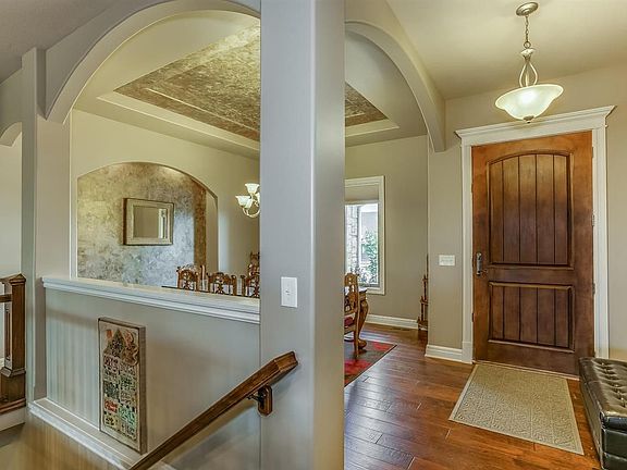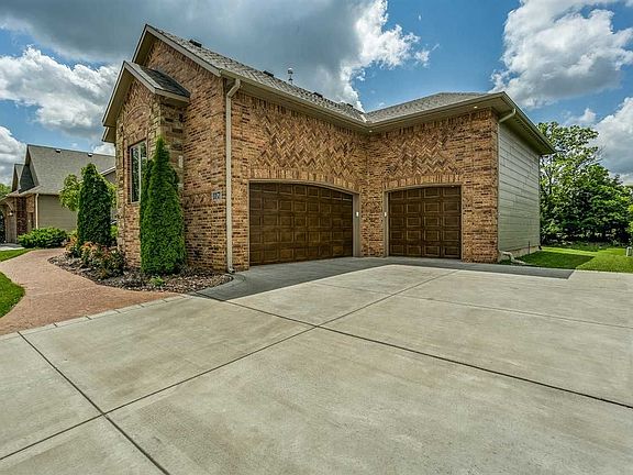 This exquisite former model home is breathtaking from the first glance! Beginning with a spectacular curved front entry stairway and the custom brick and stone, the impressive details are everywhere. The desirable combination of a gorgeous open floor plan with a side-load garage, and a private tree-lined view, all comes together in this fabulous home. The main floor features spacious and open living and kitchen areas with two large dining rooms - formal and informal, beautiful wood floors, and great windows that frame the serene views. The living room also includes a stunning gas fireplace with custom built-ins. The kitchen features stunning granite counter tops and travertine backsplash, great cabinet and counter space, gorgeous cabinets with soft-close drawers, walk-in pantry, and stainless steel appliances. The owners retreat is so perfect with a huge bedroom including stylish faux painted and lighted double-tray ceiling, private views, door to the covered deck, and a spa-like bathroom with a huge walk-in tiled shower with rimless glass, separate tub, large vanity with granite, double sinks and a walk-in closet with seasonal hanging space. The master closet opens to the laundry and back entry area with double bench and seating area. The main floor also features a split bedroom plan with two bedrooms, and adjacent bathroom with tile floor, granite counter and arched accent over the tub/shower area. The walkout basement features the same attention to detail with 9' ceilings, oversized base and trim, fantastic open spacious rooms and a stunning wet bar for entertaining and enjoying the theater. The family room area includes a brick and stone fireplace and is open to the large recreation area and also to the separate theater room. The theater has built-in speakers, recessed and wall lighting and has awesome space for media viewing. The wet bar is so stylish with stunning brick bar front and concrete bar top, chic custom wall treatment, great cabinets and lots of counter space, and easily accessible to the walk-out for outdoor entertaining as well. The finished basement includes two additional bedrooms and additional bathroom with tile floor and granite counter. The exterior features include a huge covered deck with composite flooring and aluminum railing, large covered and uncovered patio areas with stamped and stained concrete overlooking the trees - the absolute perfect indoor and outdoor living areas to enjoy with family and friends!