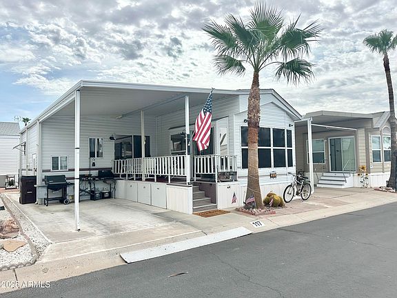 Welcome to your new home in this HIGHLY DESIRABLE 55+ RESORT filled with endless activities, pools,spa and a fabulous Clubhouse just a short walk away! This CHARMING park model with GREAT CURB appeal offers the perfect blend of comfort, convenience, and resort style living! Step inside to find a SPACIOUS, light and bright floor plan featuring a LARGE ARIZONA ROOM and a welcoming front living space, perfect for entertaining family and friends. The POPULAR U-SHAPED KITCHEN is a chef's delight with a FULL SIZE SMOOTH TOP STOVE, MICROWAVE, DISHWASHER, RO DRINKING WATER SYSTEM,PLENTY OF COUNTER SPACE and ample light colored cabinetry for all your storage needs. The home offers 1 BEDROOM AND 1.5 BATHROOMS, including a convenient guest half bath. The main bathroom features a walk in shower, stylish vanity, and good storage. The bedroom is comfortable and cozy with a queen size bed, grand mirrored closet doors, BUILT IN DESK AREA-ideal for your home office needs or great for a hobby area. An additional hallway closet provides even more storage space. The AZ room is a true highlight with a sofa sleeper, BUILT IN BAR, and plenty of space for gatherings! You'll also appreciate the handy laundry area with a stackable washer/dryer and extra cabinetry. Outside, enjoy a LARGE DECK AND BACK PATIO, perfect for soaking up the AZ sunshine or hosting barbecues. A BUILT ON shed includes room for tools, WATER SOFTENER and Even better, a BRAND NEW ROOF AND NEW A/C(installed in May) adds PEACE OF MIND. THIS WELL MAINTAINED property checks all the boxes-MOVE IN READY, COMFORTABLE AND LOCATED IN A VIBRANT RESORT where fun and relaxation go hand in hand. OWN THE LAND..OWN THE FUN. COME LIVE THE LIFESTYLE YOU DESERVE! THIS IS A MUST SEE!