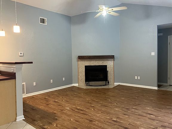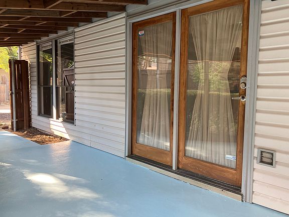 Three bedroom two bath split floor plan, vaulted ceilings, thermal low e argon insulated windows to reduce noise on Macarthur. Plantation shutters, cordless mini blinds, decorative storm and french doors, floor to ceiling windows, light bright and open. Recent Trane AC unit/ low utilities. No smoking/vaping, small pets, case by case. Kitchen overlooks living room with wood burning fireplace and marble backsplash. Both vinyl plank flooring and ceramic tile throughout. Contemporary color scheme, modern light fixtures, washer/dryer in large laundry room with double storage shelves. Updated Kitchen Cabinets, side by side refrigerator with filtered water and ice in door. New dishwasher and stove with microwave above. Extra large master bedroom with large bathroom containing double sinks, vanity and jacuzzi tub. Covered patio with lush landscape, 6' privacy fence with 2 entrance gates locking from inside. Complete privacy, security lighting, sprinkler system, and 2 car shaded drive plus extra space for guests provided to qualified renter with an 8' by 8' shelved storage shed for personal use. Secured mailbox and keyless entry. Quiet, mature neighborhood.