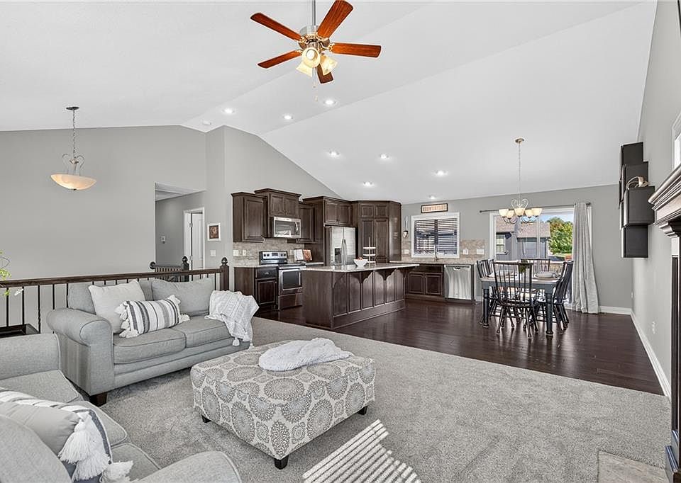 This Move In Ready Gem was Built in 2017 & Offers Exceptional Value in Raymore's Coveted Eagle Glen Community.THREE CAR GARAGE. OVERSIZED, Fenced CUL DE SAC LOT. Beautifully Maintained 3-Bedroom, 2.5-Bath Split-Entry Home Sits on Huge Corner Lot in a Quiet Cul-de-Sac. Step Inside to an Open-Concept Layout Featuring a Spacious Great Room with a Gas Fireplace & Newer Carpeting on Main Level. The Kitchen is a Chef’s Delight, Showcasing Granite Countertops, Rich Stained Cabinetry, Stainless Steel Appliances, Large Island, Walk In Pantry, & Dining Area. Retreat to the Primary Suite Complete with a Walk-in Shower, Double Vanity, and Huge Walk-in Closet. Two Secondary Bedrooms and the Convenient Bedroom Level Laundry Makes Everyday Living Easier. Downstairs, Enjoy the Finished Lower-Level Recreation Room with a Half Bath—Ideal for a Media Room, Playroom, Home Office or Could Even Be Easily Converted to a 4th Bedroom. Step Outside to a Huge, Fenced Backyard with a Nice Deck, Offering Plenty of Room for Play, Pets, and Gatherings. The Spacious Three-Car Garage Provides Ample Storage & Parking. Enjoy the Many Neighborhood Amenities Including Wooded Walking Trails, Resort-Style Pool with Cabana, and Separate Splash Pool. All of This in a Fantastic Location with Easy Highway Access. Don’t Miss this One – Welcome Home!