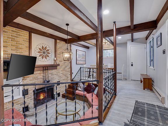 Charming chalet in an amenity-filled gated community with two beautiful lakes, pools, tennis courts, clubhouse, and 24-hour security. Features include a sunken living room with brick fireplace, dining area, eat-in kitchen, 3 bedrooms, 1.5 baths, and a custom wood floating staircase. Enjoy the huge covered porch and brand-new septic system for peace of mind. Walking distance to the lake and just minutes to skiing, waterparks, and outlet shopping—perfect for year-round living or a vacation getaway!