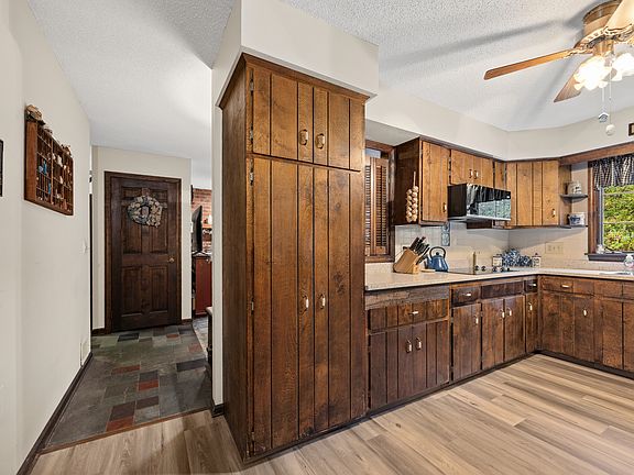 Masonry beehive fireplaceQuartz countertopsFieldstone laden groundsBay windowsFormal dining roomEat-in kitchenWood flooring