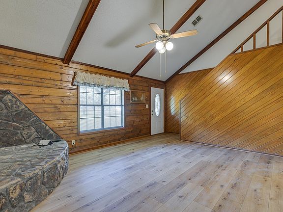 Welcome to this beautiful log home sitting on just under 2 acres with a concrete driveway, large front yard, and a full-length front porch perfect for relaxing outdoors. Step inside to the inviting living room featuring an accent wood wall, exposed wood beams, and a pitched ceiling that adds warmth and character. From the living room, a small hallway leads to a full bathroom with tile flooring and tile countertops and a bedroom complete with a walk-in closet, built-in desk, and custom cabinetry. The spacious primary suite is also on the main floor and offers a built-in vanity, cabinetry and drawers, a large walk-in closet with shelving, and an en suite bathroom with double sinks, tiled countertops, and a massive jetted soaking tub with stone step-ups. Just off the living room, the dining area includes a built-in desk and opens to the full-length back porch overlooking the fenced backyard. The kitchen features a large island with bar seating, tile countertops, and an abundance of cabinets and built-ins. Nearby, the laundry room provides additional built-in cabinets and tile counters. At the end of the hall, you’ll find the two-car garage with two storage closets. Outside, there’s a massive shop with a roll-up door, covered RV parking, and an additional detached covered carport—perfect for storage, hobbies, or equipment. Upstairs, to the right is a bedroom with a walk-in closet, built-in shelving, desk, and a wood accent wall. To the left, you’ll find a spacious den with built-in cabinets and countertop, a full bathroom with tile finishes, and another bedroom featuring a built-in desk, cabinetry, and walk-in closet with shelving. This well-maintained property offers endless space, custom built-ins throughout, and the charm of rustic design blended with functional living.