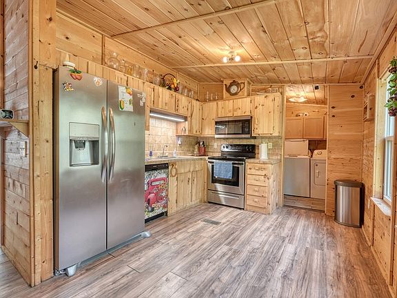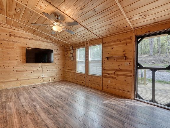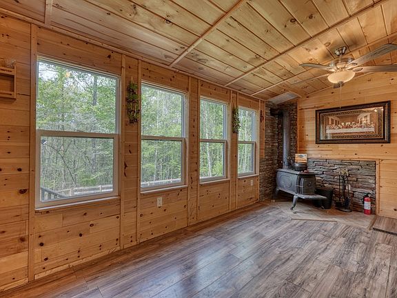 Remodeled Mountain Retreat! Step into charm and comfort with this beautifully remodeled 3BR/2BA home—thoughtfully transformed into a warm and inviting mountain getaway. Enter through the 8x23 ft deck and into vaulted ceilings, rich tongue-and-groove walls, stylish ceiling fans+light fixtures, rustic wood-look laminate floors, and sliding barn doors for a touch of rustic elegance. Master Suite: Enjoy a split floor plan with a fully renovated master bedroom featuring a walk-in closet and a stunning bath with a large classic clawfoot tub, surrounding wall rectangular tile, tiled flooring, and a tub/shower combo.Guest Bedrooms: Located on the opposite side of the home for added privacy, both remaining bedrooms offer walk-in closets. Kitchen & Dining features pine cabinetry, tile backsplash, stainless steel appliances, and opens into a dining room with five windows along the wall, offering serene views of the private backyard. A wood stove with stacked stone surround provides a cozy source of supplemental—or primary—heat. Relax on the screened back porch adjacent to the kitchen overlooks the landscaped, private backyard. Fenced-in backyard perfect for pets. Need extra space? A 12x16 structure has been converted into a charming office or guest suite, plus an additional 12x16 storage outbuilding provides room for tools or hobbies. No Restrictions: enjoy the freedom to garden, expand, or simply soak in the peaceful North Georgia setting. Conveniently located to Blairsville, Blue Ridge, and Murphy.
