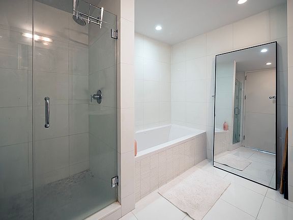 The primary bedroom offers exceptional comfort, with space for a desk or dressing area, and a spa-like ensuite bathroom complete with a soaking tub, separate glass shower, and dual vanity. Both bathrooms are enhanced with radiant floor heating, while five custom-built closets, a new washer/dryer, and 9-foot ceilings complete the home’s thoughtful interior features.