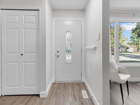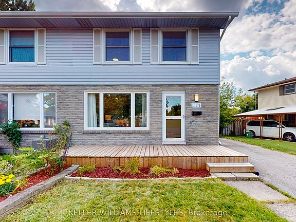 Welcome to this charming 2-storey semi-detached home in a family-oriented neighborhood! The main floor features a bright living room with a large window, an eat-in kitchen with sliding doors to the backyard, a 2-piece bathroom, and convenient side entry. Upstairs offers 3 spacious bedrooms and a beautifully renovated 4-piece bath (2025). The finished basement includes a cozy family room, laundry/utility space, and plenty of storage. Outside, enjoy a covered patio, fully fenced yard, and shed.Recent updates include: full interior painting (2025), renovated bathroom (2025), lighting fixtures (2025) hot water tank rental replacement (2025), roof shingles (2023), furnace & A/C (2023), front deck (2023), and flooring (2020).Located close to White Oaks Mall, Hwy 401, shopping, restaurants, and schools, this home is perfect for families and commuters alike!