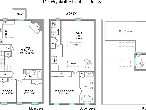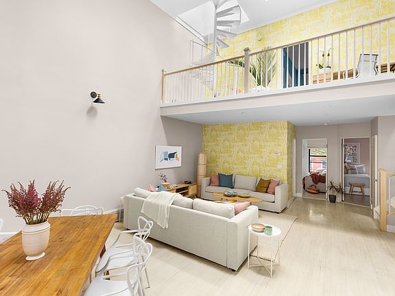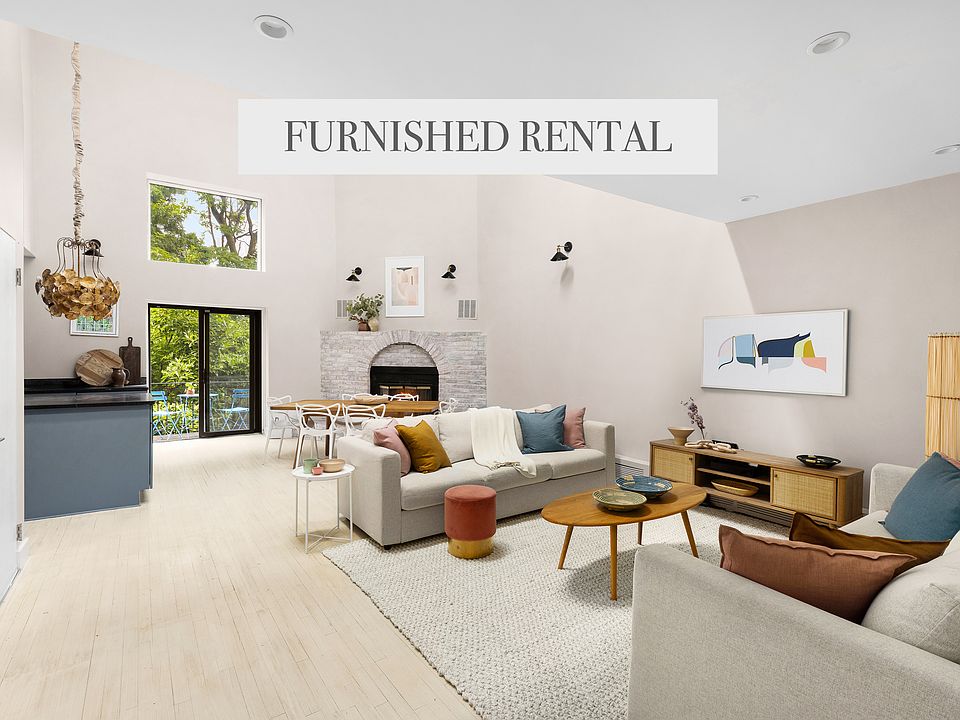 Impressive sun-drenched 3 bed/2 bath home spanning two spacious levels plus a private roof deck with Manhattan & Brooklyn city views. As soon as you enter you enter this duplex you are taken aback by the double height ceiling, skylights and extraordinary proportions across the large 25" W x 46" D floor plan. The main level features 18' ceilings, a vast living-kitchen-dining area, exposed brick, a wood burning fireplace and a charming terrace perfect just off the kitchen. The windowed kitchen includes top-of-the-line appliances from Viking and Bosch.