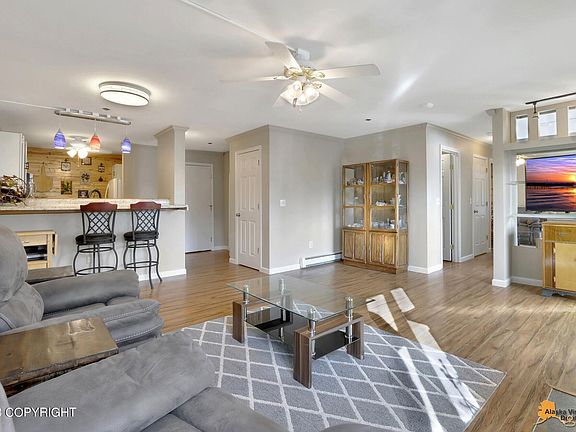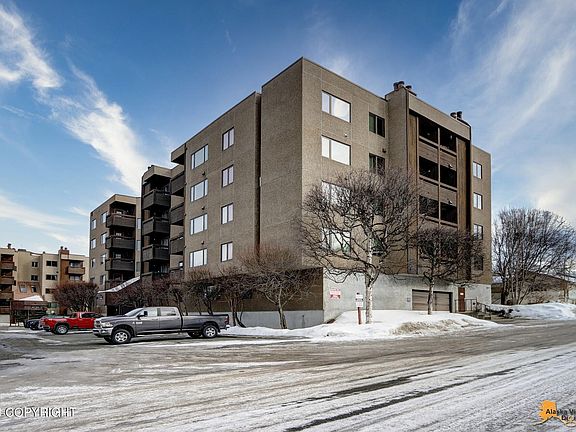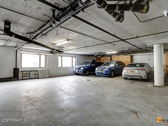 2 Side by side GARAGE parking spaces w/storage cabinets. Faces East so you can enjoy the sunshine pouring in the home, open kitchen to living room, wood burning fireplace, stacked W/D in unit. Dues include HEAT. Refreshed & repainted. Newer LVP flooring thru out home. Large primary BR w/walk in closet. Easily fits King size bed. Elevator. Locked double entry doors to enter building lobby EnjoyThe roof top deck in the summer. (recently being renovated). Great Downtown location to be close to park strip. partial Chugach mountain views.