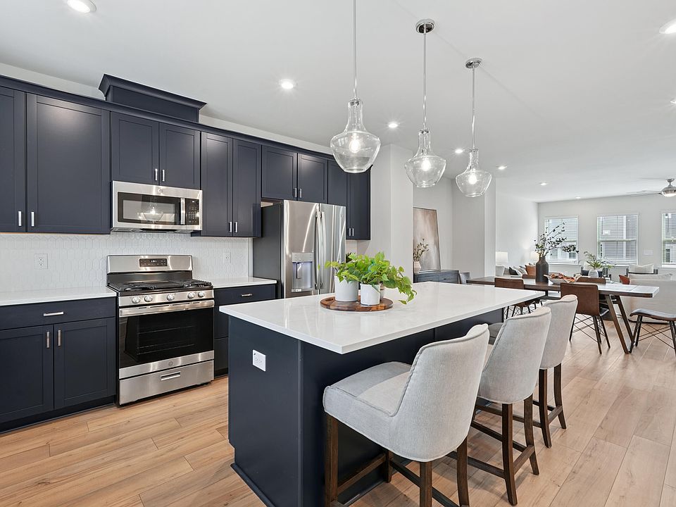 Move-In Ready! Welcome Home to The RYDER! This spacious 4-bedroom, 3.5-bath end-unit townhome in The Mews at Holding Village offers modern style and comfort. The first floor features a guest suite with full bath and a convenient built-in drop zone. An oak tread staircase leads to the second floor, where a bright great room, dining area, and dream kitchen with Admiral cabinets, quartz countertops, large island, and pendant lighting await—perfect for entertaining or everyday living. Walk-in pantry. Driftwood EVP flooring flows throughout the main level, and GE stainless fridge and 2'' faux wood blinds are included. Upstairs, the primary suite features a tiled shower and large walk-in closets, accompanied by two additional bedrooms, a full bath, and laundry room. Additional highlights include an attached 2-car garage, 9-ft ceilings on all floors, tankless gas water heater, Ring doorbell, Schlage smart lock, EV charging outlet, and whole-house surge protector. Enjoy resort-style community living with a 15-acre lake, pool, clubhouse, parks, and trails—all just minutes from schools, shopping, and restaurants.