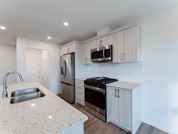 BRAND NEW | NO CONDO FEES | 3 BEDROOMS | 2.5 BATHS | DOUBLE ATTACHED GARAGE | Facing Future School | Solar Panels Welcome to this stunning brand-new 2-storey townhome in the highly desirable community of Carrington, NW Calgary—with NO condo fees! Thoughtfully designed, this home features 3 spacious bedrooms, 2.5 bathrooms, triple-glazed windows, a charming front porch, and a double attached garage, along with an unfinished basement that awaits your personal touch. Step inside to discover a bright open-concept main floor with elegant LVP flooring throughout. The sleek, modern kitchen features quartz countertops, upgraded stainless steel appliances including a GAS stove, and a generous dining area, making it perfect for family gatherings or entertaining guests. A cozy living room and a convenient half bath complete the main level. Upstairs, the primary bedroom impresses with a walk-in closet and a 4-piece ensuite. Two additional bedrooms, a second full bath, and a spacious balcony—perfect for morning coffee or evening relaxation—round out the upper level. You’ll also enjoy the convenience of upper-floor laundry. The unfinished basement comes with plumbing rough-ins for future development, while the home is already equipped with a 200-amp panel, EV charging rough-in, and solar panels. Located close to shopping, scenic ponds, and quick access to major highways, this home combines comfort, modern upgrades, and everyday convenience—all with no condo fees!