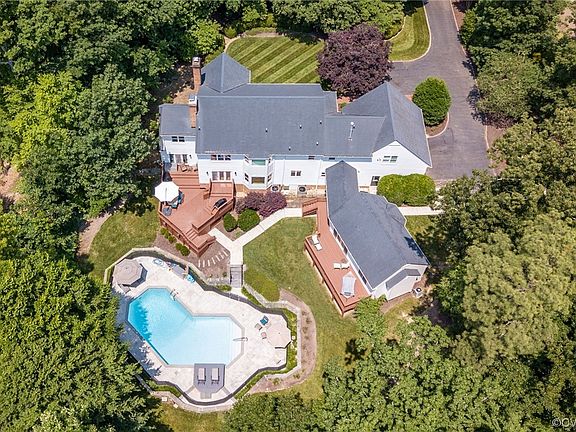 Welcome to your dream oasis! This exquisite home is a testament to luxury and elegance. Nestled on a mostly wooded lot, this gem offers the utmost privacy. Inside, you'll be greeted in the foyer by newly painted walls and shining hardwood floors. The attention to detail is evident throughout, as this home has been meticulously maintained to perfection. Dual staircases and a large attached garage offer practicality and convenience, while the abundance of storage space ensures that every item has its place. Step onto the massive multi-tiered deck, where you'll be captivated by the breathtaking views of the pool and the lush surroundings. Indulge in the ultimate relaxation with a hot tub, or delight in endless summer days lounging by the in-ground pool, both complete with a cover for added convenience. The professionally landscaped grounds, the deck & the poolhouse serve as an extension of your living space, perfect for entertaining. Escape to your primary suite, a haven of relaxation featuring a fireplace, a sitting room, walk-in closets, and an ensuite bath. Don't miss this opportunity to own a truly extraordinary home, where luxury, privacy, and meticulous craftsmanship abound!