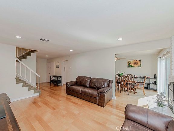 This light-filled home features dual-pane windows, recessed lighting, scraped ceilings, and elegant wood flooring throughout the living, dining, and kitchen areas. The upgraded kitchen includes Corian countertops, a newer built-in microwave and dishwasher, and a cozy breakfast nook that flows seamlessly into the family room with the cabinets. The spacious living room features a warm, inviting fireplace—perfect for relaxing evenings.