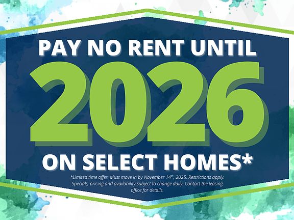 - Special offer! No Rent Until 2026 on Select Homes! *Limited time offer. Must move in by November 14th, 2025. Restrictions apply. Specials, pricing and availability subject to change daily. Contact the leasing office for details.