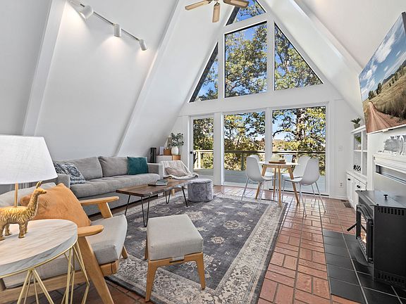 Fire pitCharming a-frameStunning lake viewsGalley kitchenLarge deckOpen floor planDining table