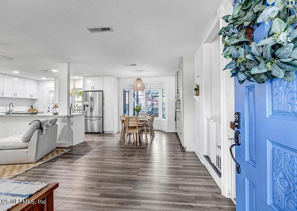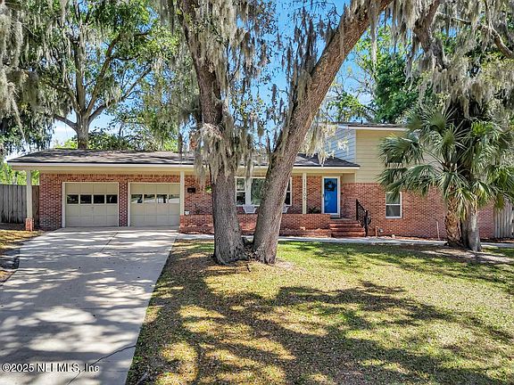 First Right Of Refusal. FROR, Taking Offers! Mid-century modern pool home in the heart of desirable Ft. Caroline with rolling hills & tree lined streets & river breezes, this community is like no other. Open concept living. Living room, dining room and kitchen on the main level. 3 bedrooms upstairs with two full baths, including the primary en-suite, An additional bedroom, den and a office/5th bedroom are on the lower level with views of the screened-in pool and outdoor living. The laundry room is also on the lower level. From the beautifully appointed kitchen there is an additional door to the outdoor living space. This home was made for entertaining with plenty of room for lawn games, a raised deck perfect for grilling and a beautiful, fully enclosed in-ground pool to enjoy the warm summer days. This home sits on a large lot with two driveways, giving you tons of space for your boat or RV. Don't miss your chance to make this home yours! Updates include all new windows and sliding doors, throughout. Fresh paint inside and outside trim. New bathroom vanities and hall bath remodel. Air Scrubber add on to A/C system for whole house filtration.