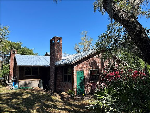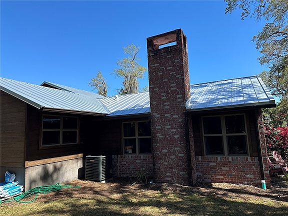 This Riverfront Home with deep water dock has NEW standing seam Metal Roof, New septic, New Impact windows and doors, New 40X24 metal out building with roll up doors, New two car covered parking area and newer A/C. Enjoy beautiful views of your own waterfront preserve from the large rear deck or balcony. Two wood burning fireplaces. Situated in a beautiful oak hammock. With 200 fruit trees, vines and shrubs with over 50 varieties which allows production almost year around. The front of the property has a fresh water pond. Possible In Law suite as the 4th bedroom has a private entrance! .