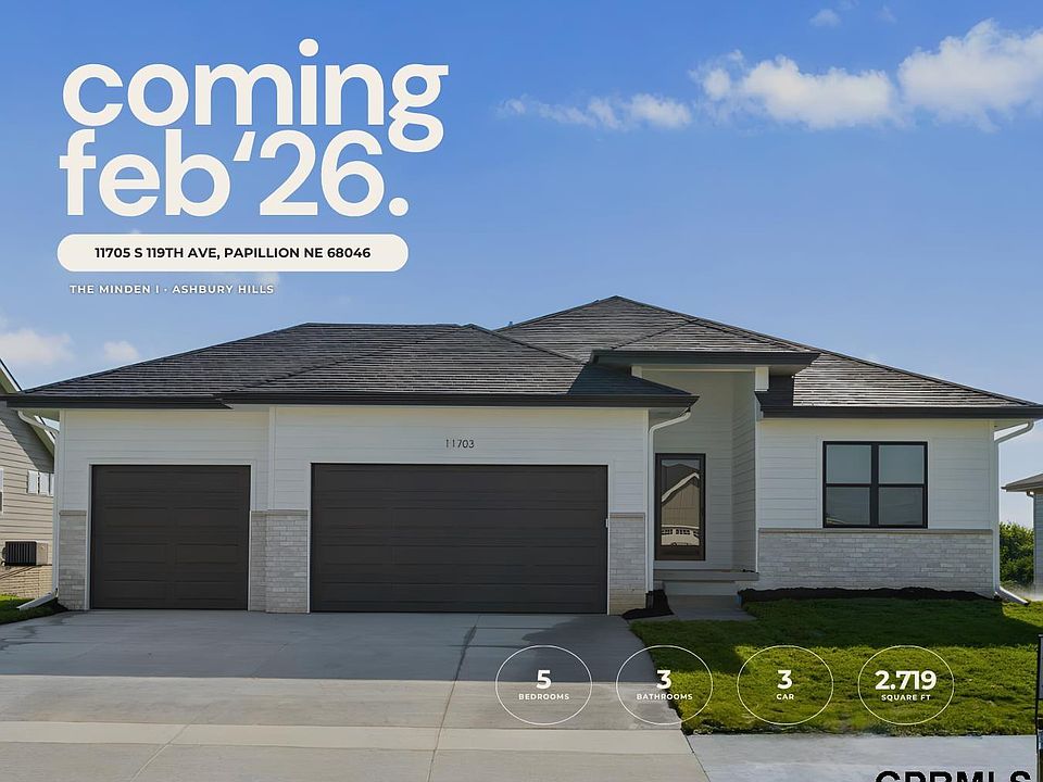 The Minden I by THI Builders—completion date end of February 2026! Available to show/for sale! This plan offers 5 bedrooms on a flat lot with covered patio, fully finished basement in the sought after Ashbury Hills neighborhood complete with a clubhouse, pool and pickleball courts! The kitchen is loaded with upgrades: quartz counters, a custom vented hood, built-in oven and gas cooktop, full tile backsplash, SS appliances, & soft-close drawers and custom pull outs that all flows to the open concept living area w/ full stone to ceiling electric fireplace w/ mantle. Black window package upgrade. Enjoy outdoor living on the covered patio or retreat to the primary suite with double sinks, tiled shower & walk-in closet. The finished LL adds two additional bedrooms, full bath, and a huge rec space perfect for movie nights, gym, or playroom. Located in Papillion School district & minutes from Shadow Lake, Werner Park, Prairie Queen Lake, and Walnut Creek Rec Area.